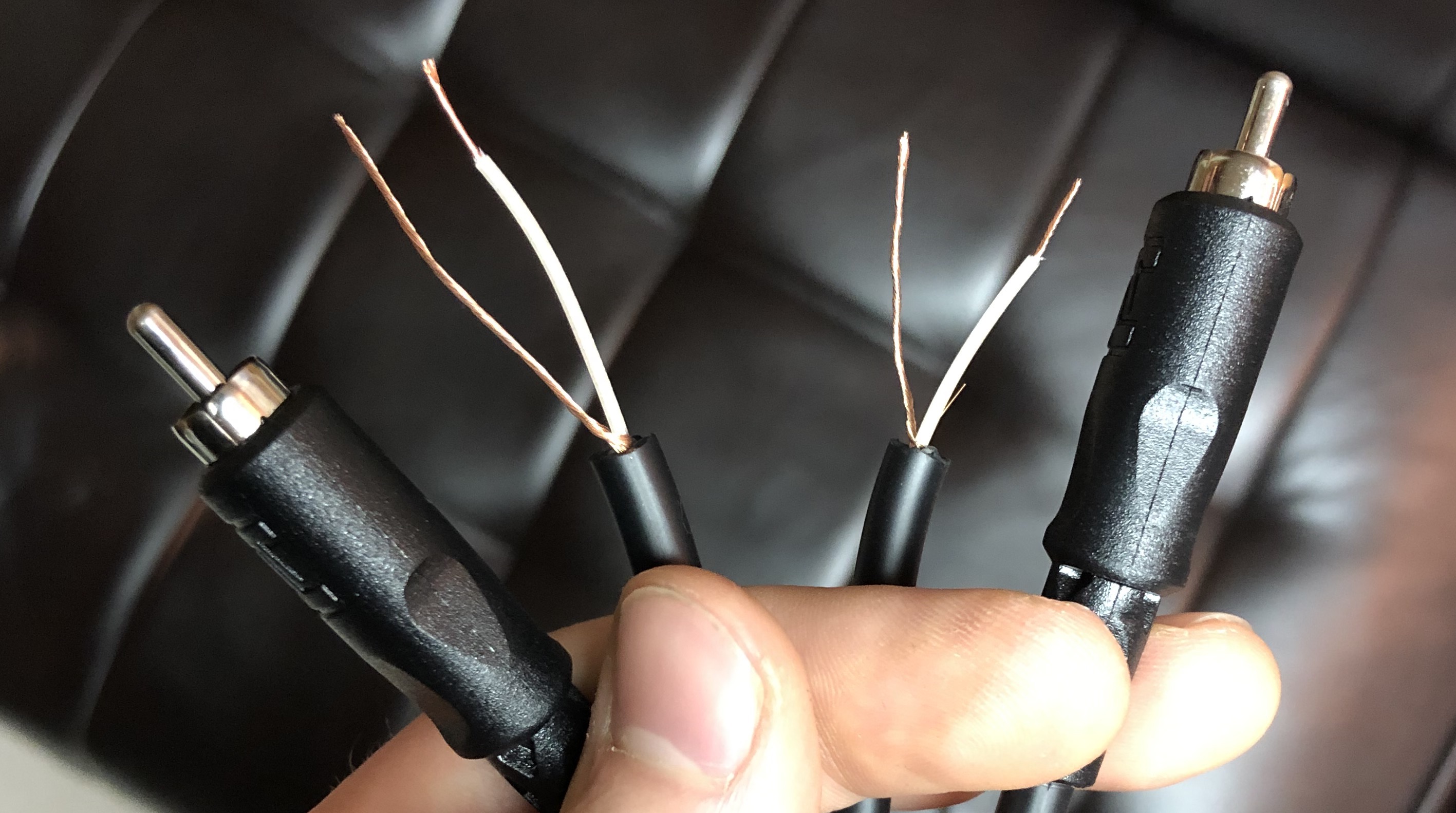 In this step, we’ll be making the one actual modification to the organ: cutting & splicing the speaker wires. Before that, you’ll want to cut your RCA cable and get it ready to attach. I used a single 10′ RCA cable, which I cut pretty much exactly in half (two 5′ halves). You can choose to use a smaller cable if you plan on leaving your line out box inside the back of the organ, but I found that a 10′ cable was perfect for being able to set the box up on top of the organ.
