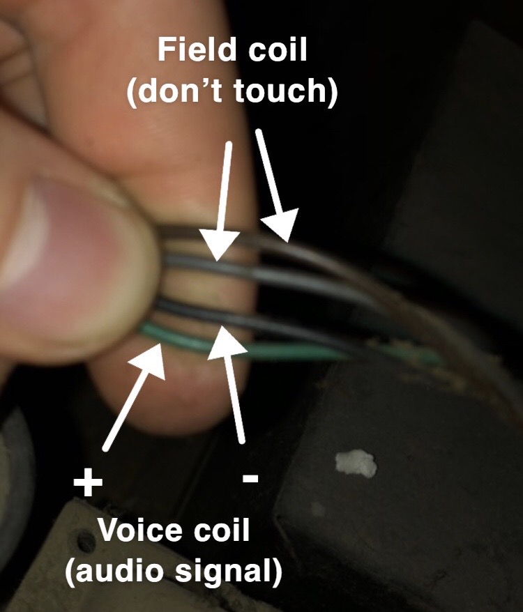 In a nutshell, EM speakers were popular before PM (aka “Permanent Magnet”) speakers became the new standard. EM speakers required two additional “field coil” wires to power an electromagnet. This means you’ll want to be very careful not to accidentally cut the field coil wires. What you’re looking for is a green wire (positive signal) and a black wire (negative signal). The brown and gray wires should be left alone.